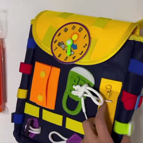 This colorful and fun busy backpack is designed to help children develop essential life skills while keeping them entertained. Made with soft, child-safe materials, it features a variety of interactive activities to stimulate fine motor skills, problem-solving, and creativity.