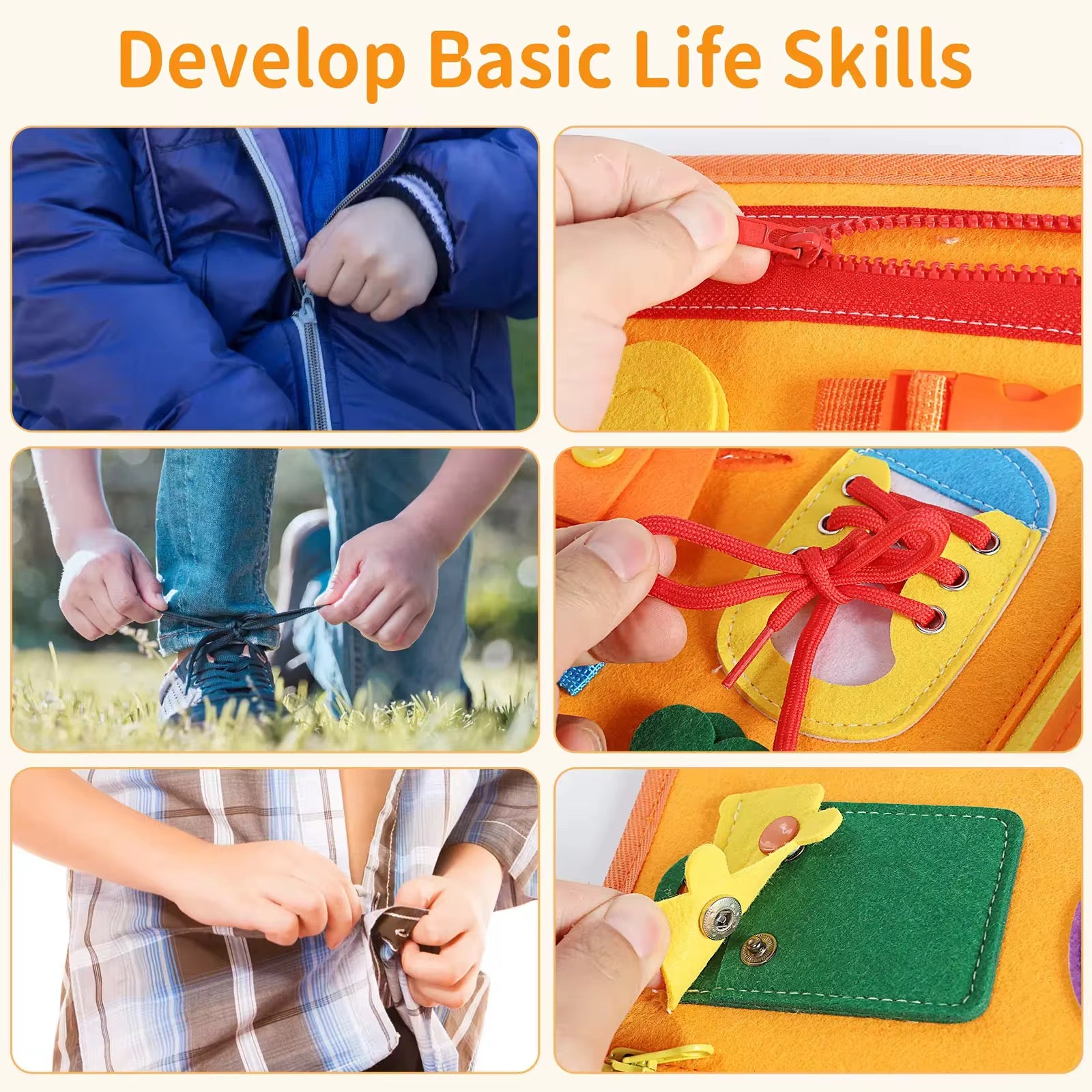 • Fine Motor Skills: Encourages hand-eye coordination through activities like buckling, zipping, lacing, and buttoning.