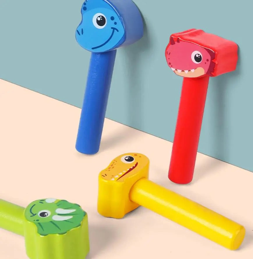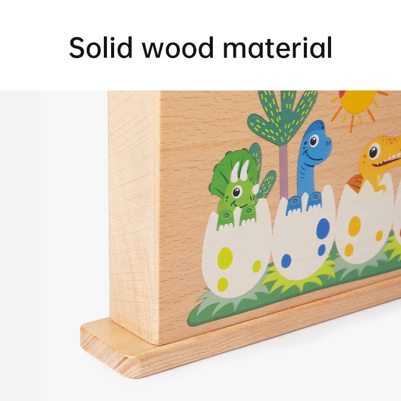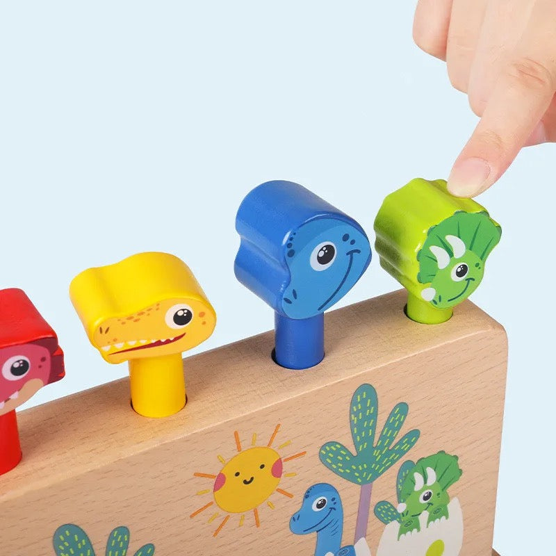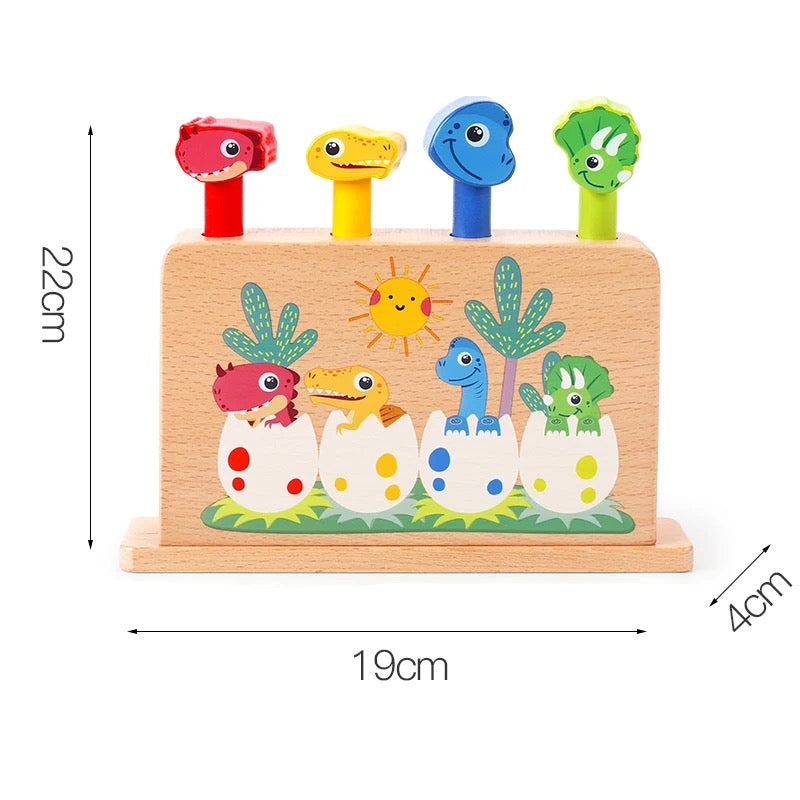 The Wooden Pop-Up Dinosaur toy is designed to captivate young children with its vibrant colors and engaging pop-up action. Featuring four adorable dinosaur characters, each placed in a spring-loaded slot, this toy provides endless fun as kids press down to make the dinosaurs pop up, helping to develop hand strength and coordination. Each dinosaur is a different color, promoting color recognition and matching skills as children learn to associate colors with specific dinosaurs.