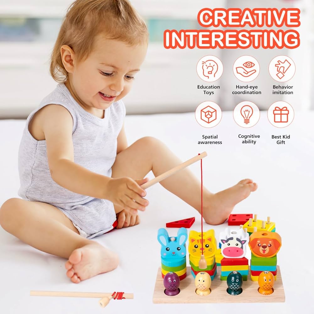 The set includes: 🪵 Wooden base with animal-shaped stacking poles 🐟 Cute magnetic fish and fishing rod for interactive play 🌈 Brightly colored stacking rings and animal tops (bear, bunny, cat, cow, and more)Kids can enjoy multiple ways to play—stacking, matching, sorting, and fishing—making it a great tool for both fun and education.